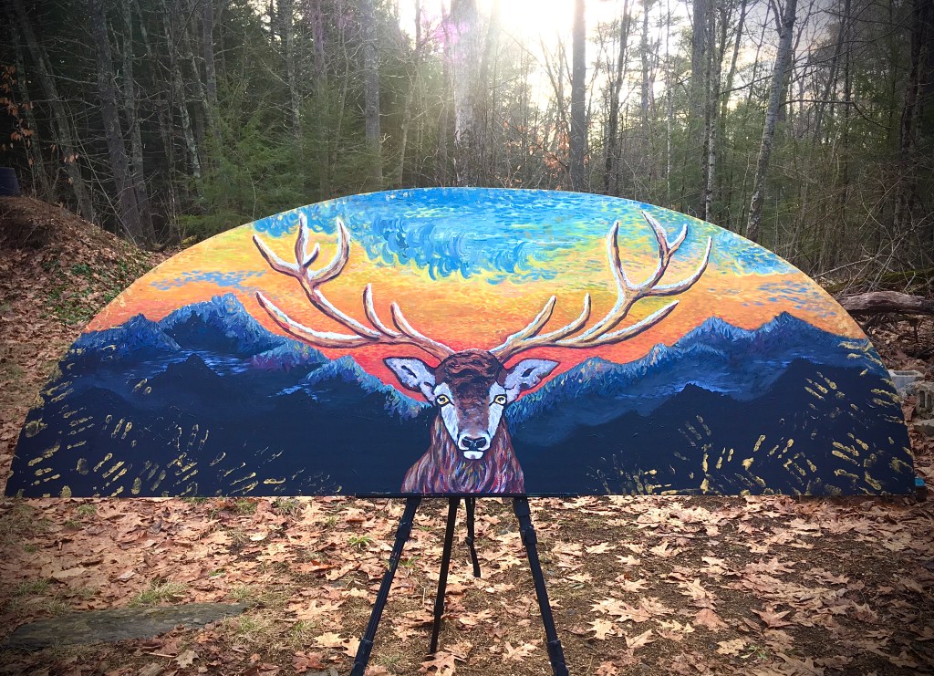 This piece honors my disir (female ancestors, according to Norse mythology) in the form of a female reindeer. The gold handprints represent the elusive ways that our ancestors reach for us or how we might reach for them.